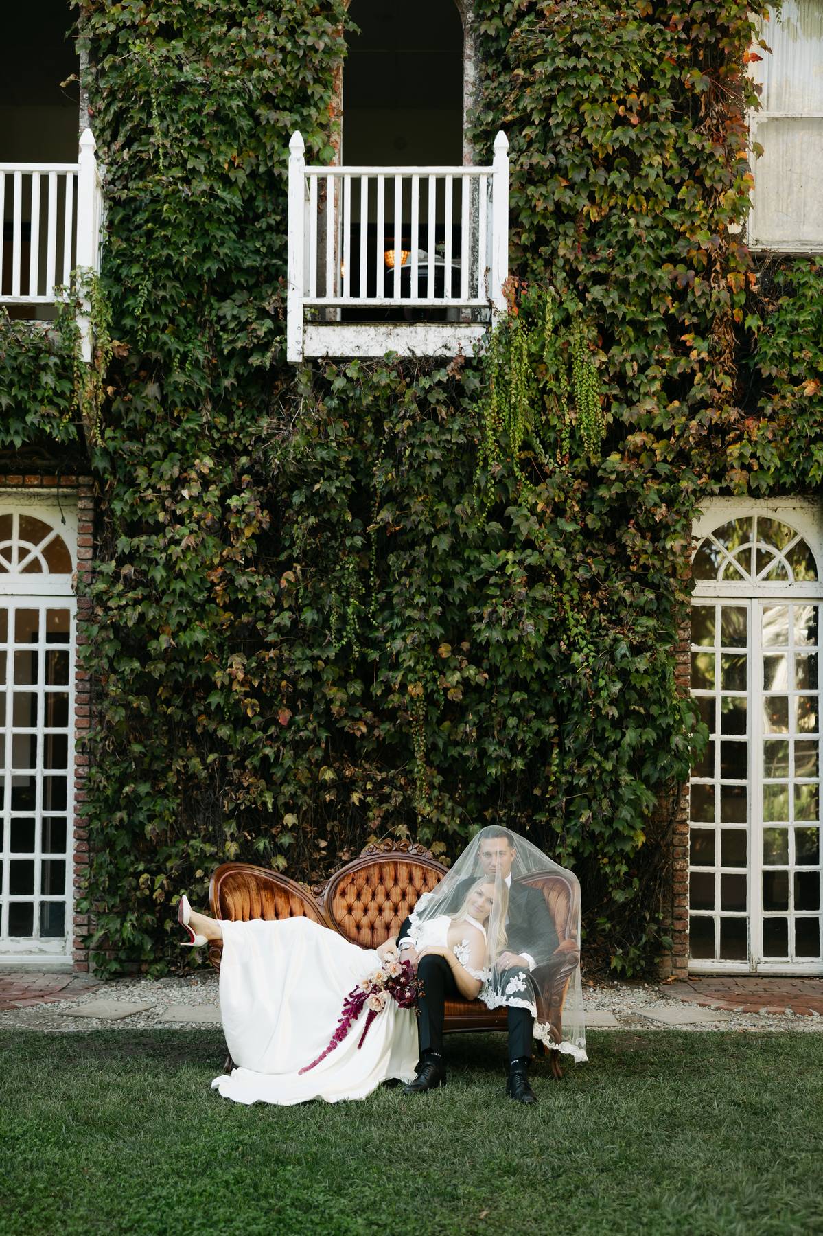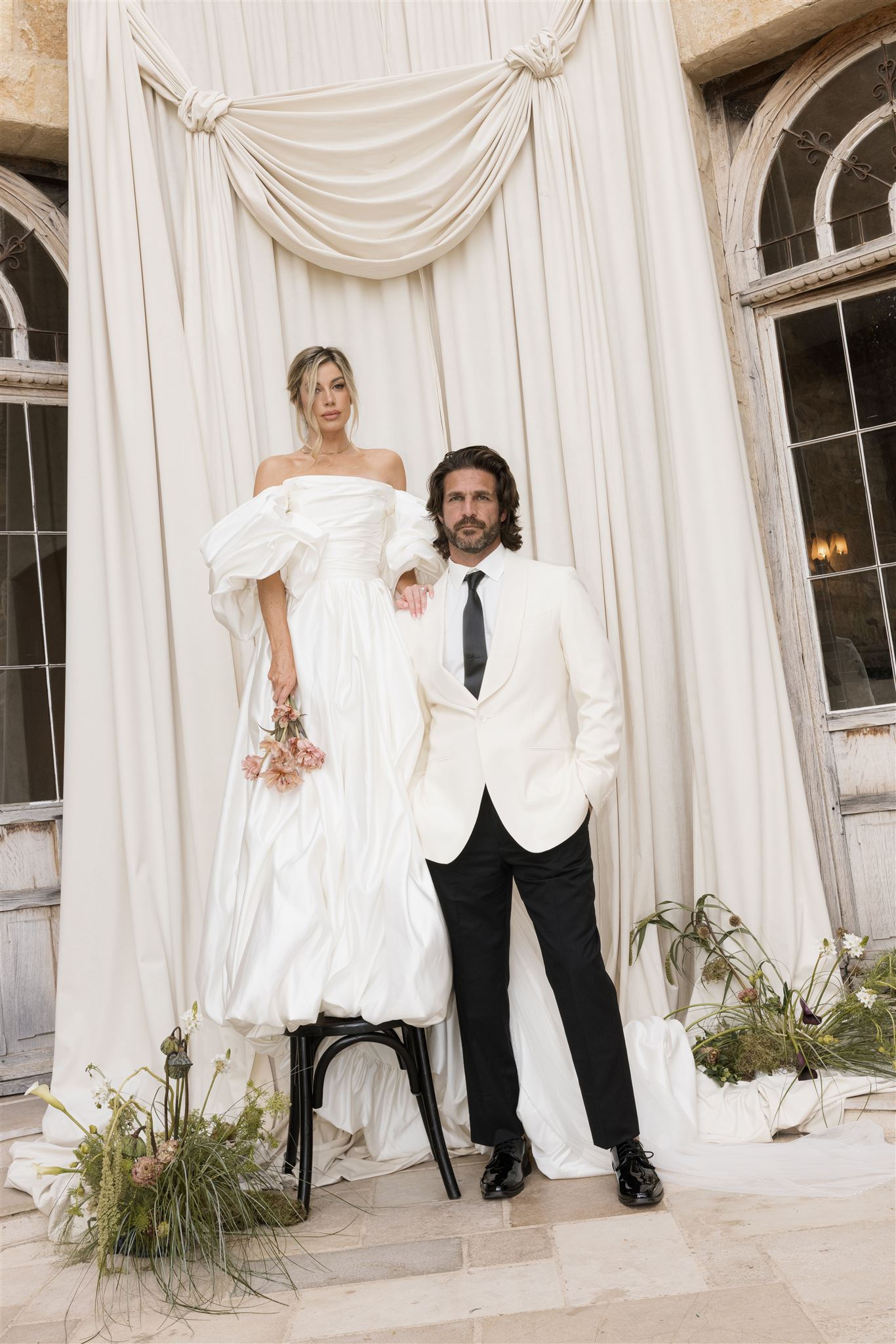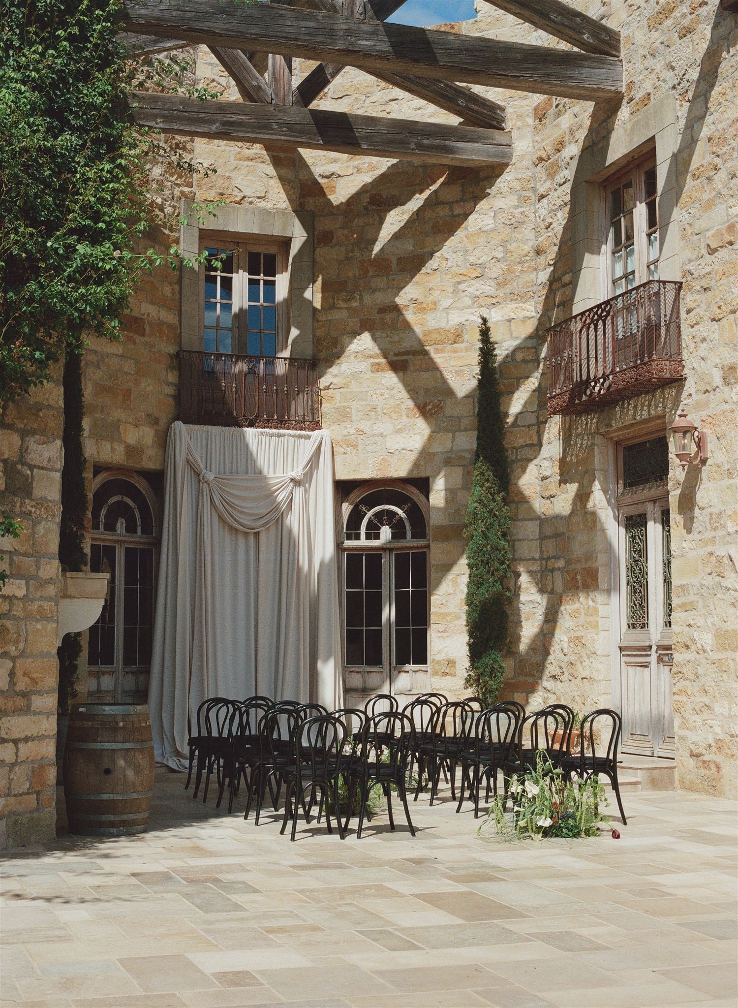 An intimate ceremony framed by the Villa's timeworn brick, with elegant draping creating movement and contrast against the historic textures. Ground florals designed to add a sculptural softness to an undeniably luxurious setting. Photo Credit: Jess Onesto Wedding Photographer