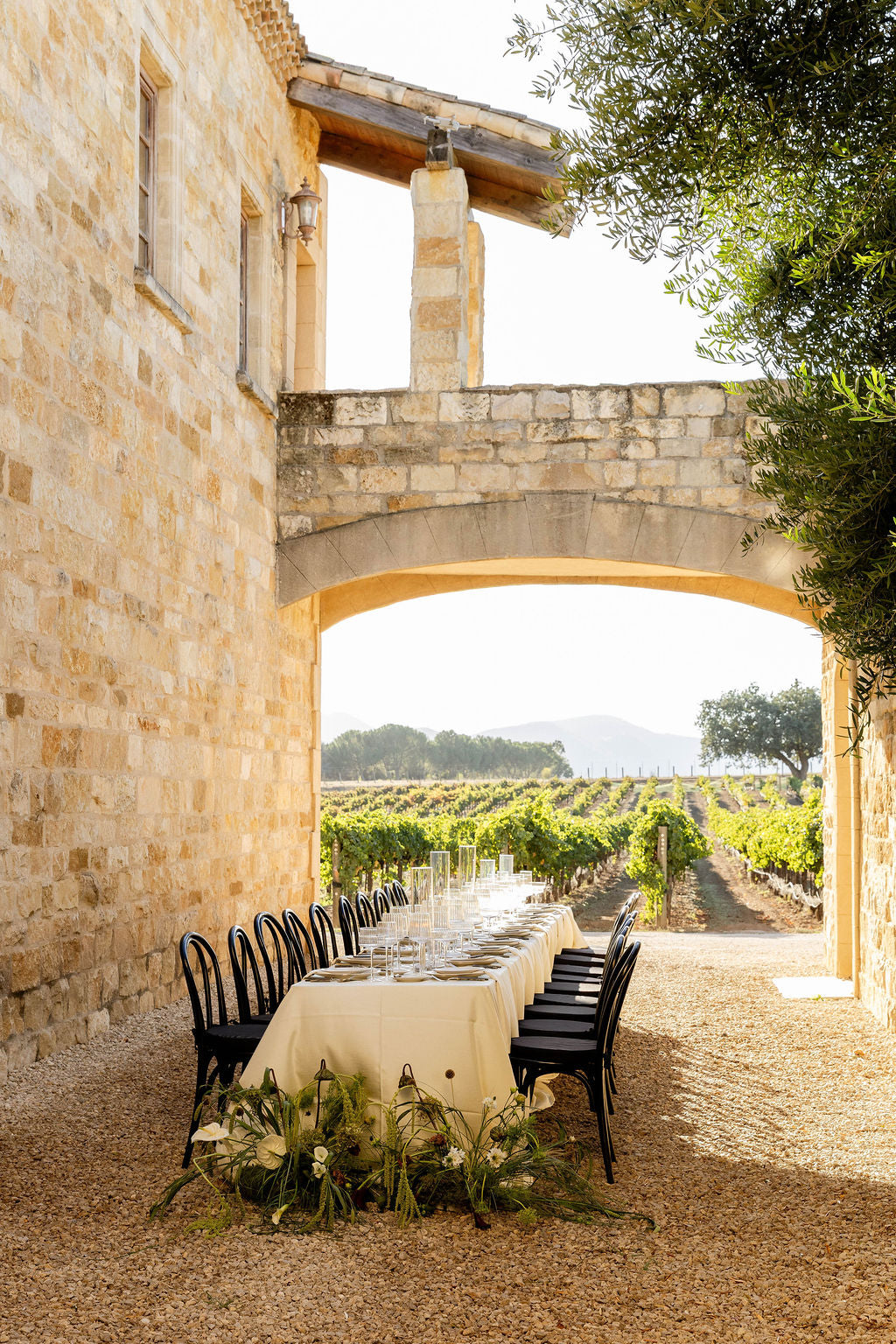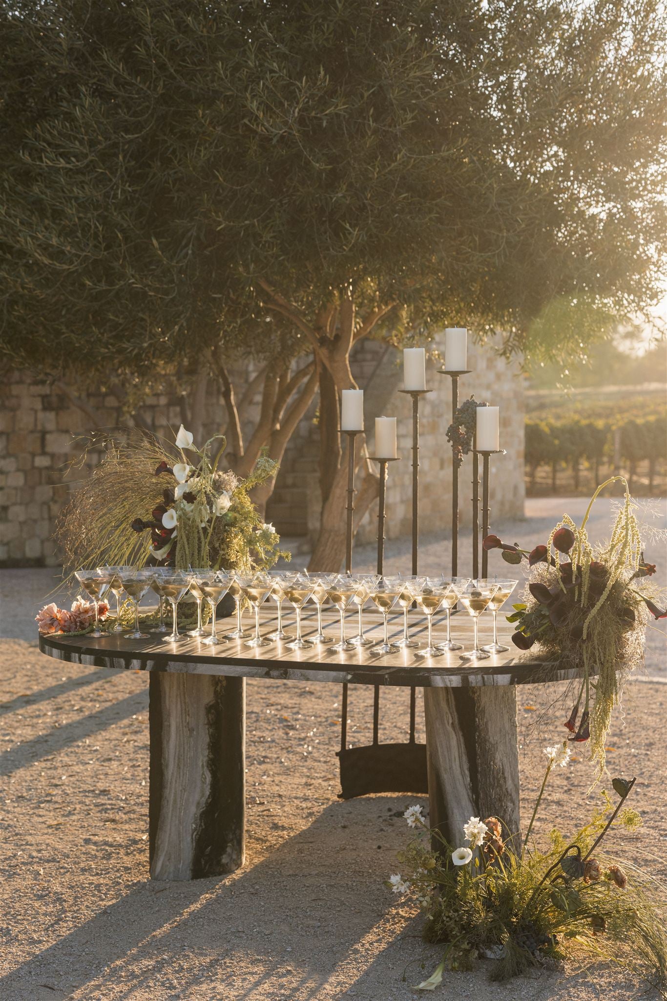An elegant ceremony table set against sweeping vineyard views. Thoughtfully styled with timeless details, the table blends romance with natural California beauty- an intimate moment framed by rolling vines and golden light. Photo: Marisa Ruth Photography
