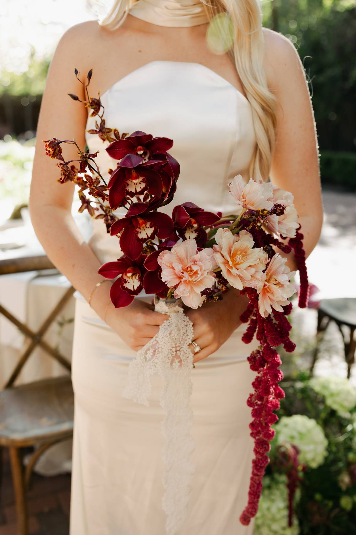 One of our favorite pieces is the bridal bouquet- here we have orchids, tulips, accented by cascading amaranthus, rich textures, lace detail- artful, expressive, and entirely one of a kind.